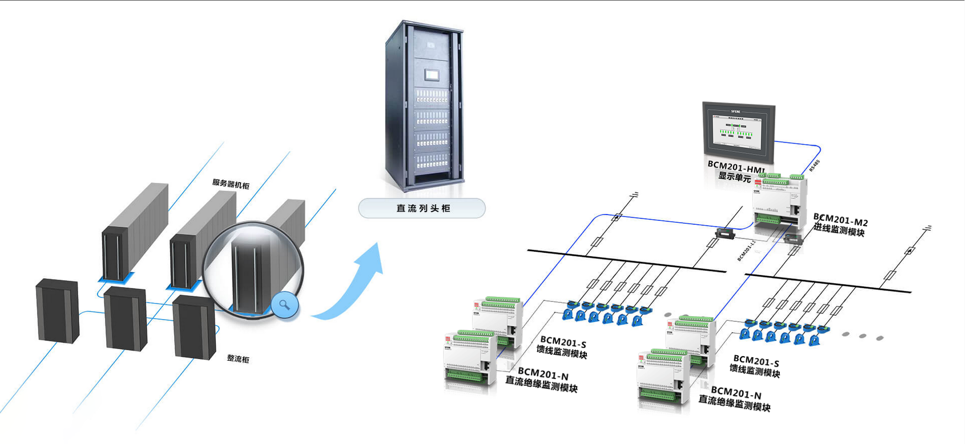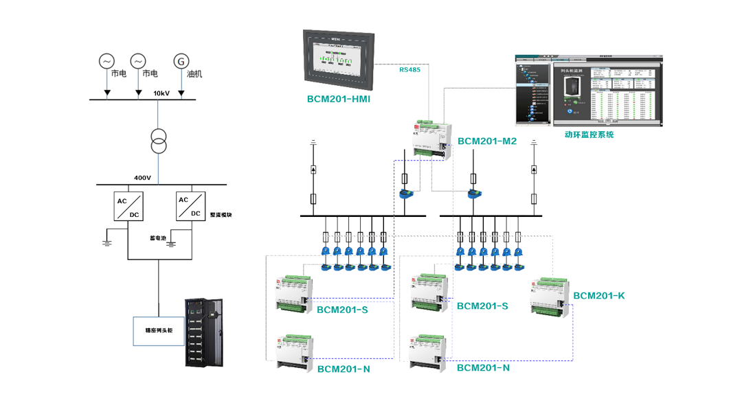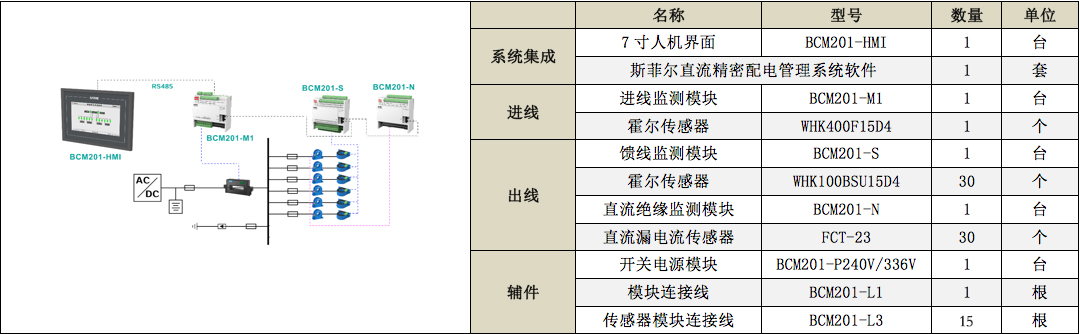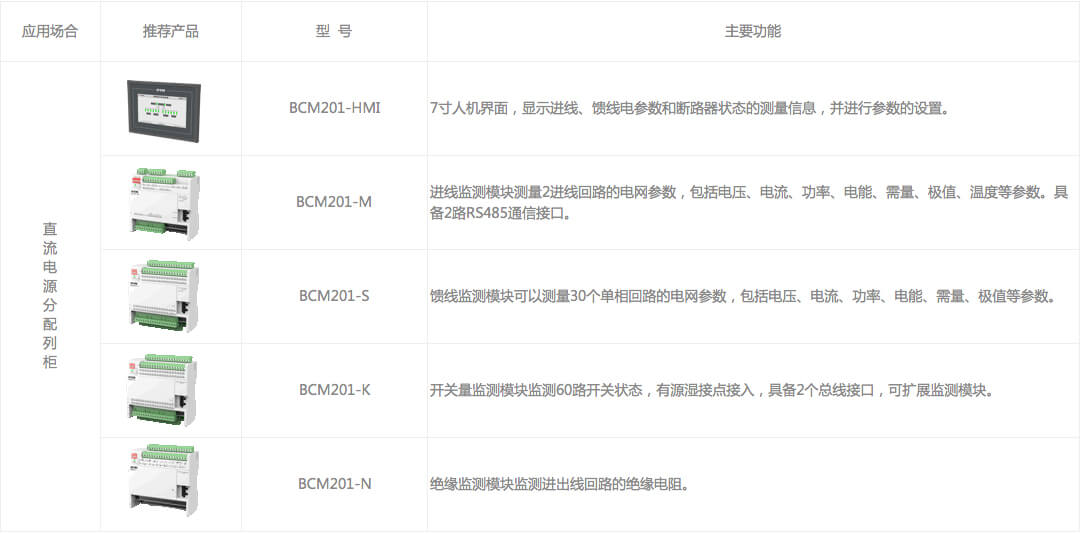 進(jìn)線回路采用BCM201-M1模塊監(jiān)測1路直流進(jìn)線,出線回路配置一個(gè)BCM201-S監(jiān)測模塊,實(shí)現(xiàn)對(duì)進(jìn)線及各個(gè)出線回路的電壓、電流、有功功率、電能、極值、需量。同時(shí)配置BCM201-N監(jiān)測模塊,實(shí)現(xiàn)隔離母線對(duì)地電壓及對(duì)地絕緣電阻測量。