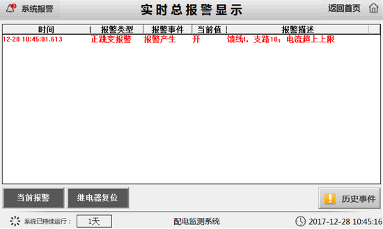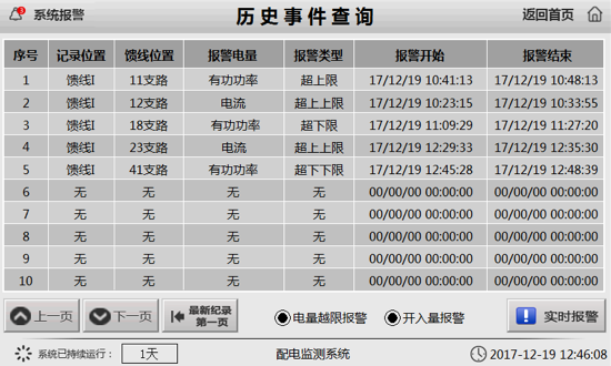 查詢電量越限報(bào)警記錄,顯示歷史報(bào)警信息;詳細(xì)記錄報(bào)警電量、報(bào)警類型及報(bào)警起始時(shí)間;通過查詢歷史事件可追溯報(bào)警時(shí)運(yùn)行線路的狀態(tài)。