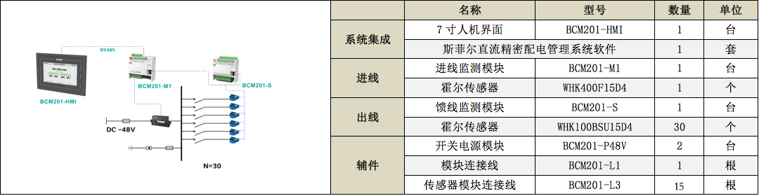 進(jìn)線回路采用BCM201-M1模塊監(jiān)測1路直流進(jìn)線,出線回路配置一個(gè)BCM201-S監(jiān)測模塊,實(shí)現(xiàn)對(duì)進(jìn)線及各個(gè)出線回路的電壓、電流、有功功率、電能、極值、需量。